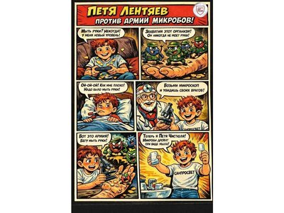 В комиксе «Личная гигиена» наш герой Петя вступает в увлекательную борьбу с армией коварных микробов! Вместе с ним юные читатели узнают какие еще секретные приемы помогут победить невидимых врагов.